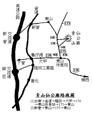 青山在東山鄉的東北邊,以標高841m的崁頭山與嘉義縣大埔鄉為界,東山鄉較低的丘陵多已開闢成農作區或果園;但是在青山仙公廟一帶的山區保持良好的森林樹木,由青山翻越崁頭山可到曾文水庫,山上視野開闊,沿途景色幽美,有時晴空萬里,有時雲霧迷漫一片白茫茫的,給鳥類提供很好的棲息環境。